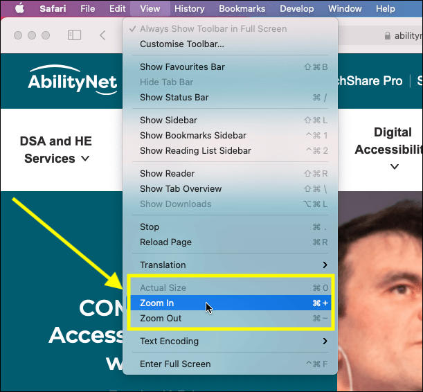 Using the menu bar options to make text larger in Safari