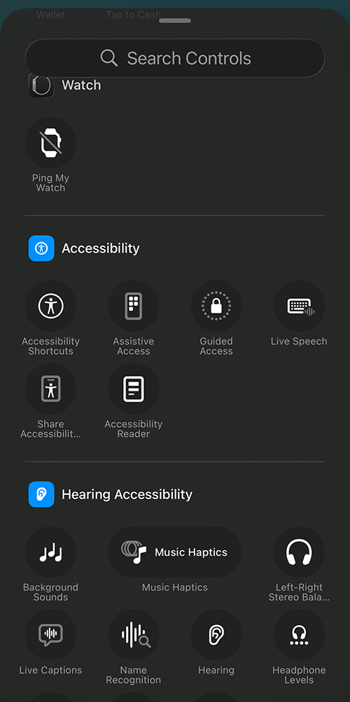 4. Scroll through the list of controls and tap the item you wish to add to the Control Centre. Accessibility items are grouped by type at the end of the list.