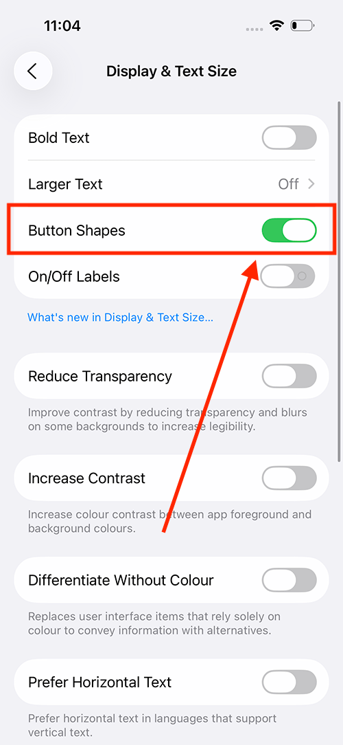 3. On the Display & Text Size screen, tap the toggle switch for Button Shapes to turn it on.