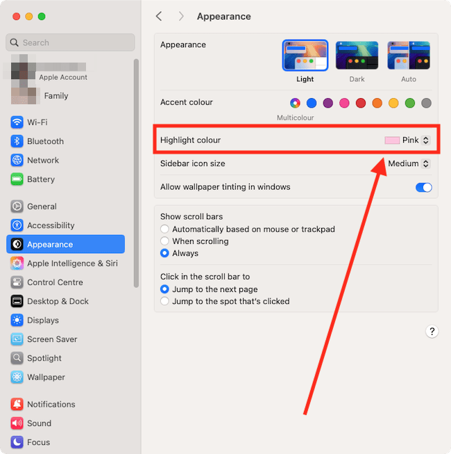 4. Changing the accent colour also changes the highlight colour (the colour used to highlight selected text) to match. To use a different colour for highlights, click on the drop-down menu for Highlight colour and choose from the options.