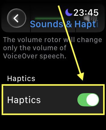18. If you don't want to receive haptic feedback (vibrations) as you navigate your Apple Watch using VoiceOver, tap the toggle switch for Haptics to turn it off.