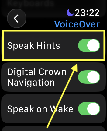 25. By default, when you select an item, you’ll receive hints such as “double-tap to activate”. To turn this off, set the toggle switch for Speak Hints to off.