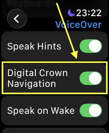 26. Another way to navigate your Apple Apple when using VoiceOver is with the Digital Crown. You rotate the Digital Crown to select an item, then double-tap the display to activate the item. To enable this, set the toggle switch for Digital Crown Navigation to On.