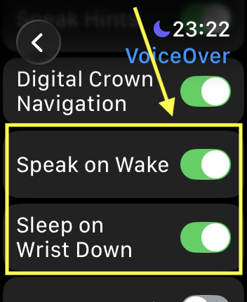 Conversely, to have VoiceOver sleep when you lower your wrist, set the toggle switch for Sleep on Wrist Down to On.