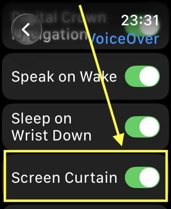 28. If you don't need the display turned on to operate your Apple Watch, turning on the Screen Curtain can give you added privacy by turning the display off. To enable the Screen Curtain, set the toggle switch Screen Curtain to On.