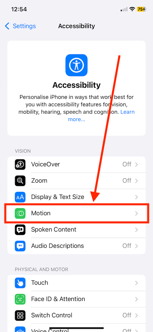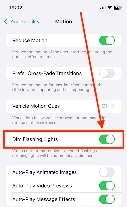 3. On the Motion screen, tap the toggle switch for Dim Flashing Lights to turn it on.