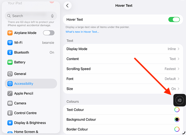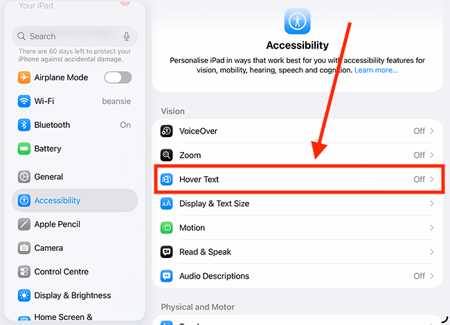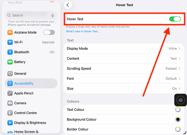 7. You can customise Hover Text settings to change how and where the enlarged text appears, making it easier to read content in a way that suits your needs. Descriptions for each setting are provided in the table below, following the Hover Text settings screenshot.