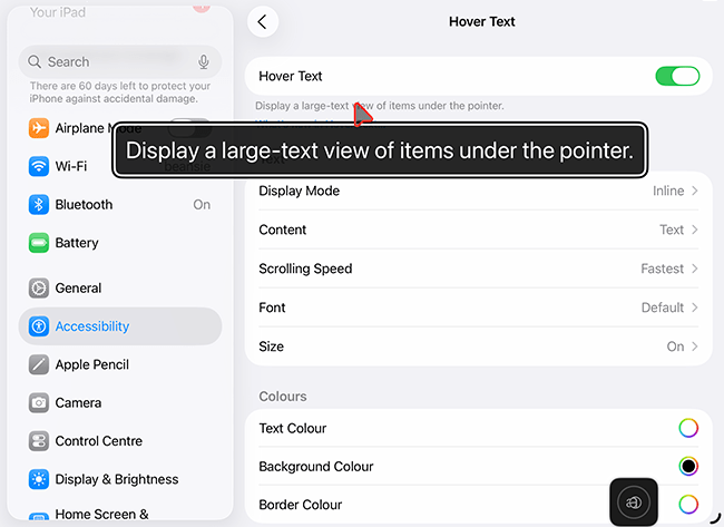 | Content | Choose what content you want to appear in the Hover Text window. By default, Hover Text displays a larger version of the text under the pointer. However, it can also show the colour of the item currently under the pointer, or both the text and the colour. To change this setting, tap Content, then select your preferred option. |