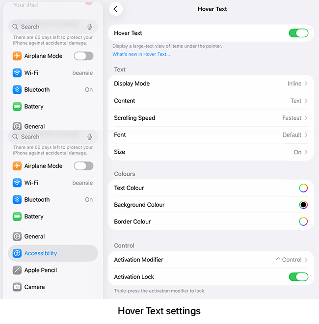 | Activation Modifier | If you have a keyboard connected to your device, you need to press and hold the Control (⌃) whilst moving the pointer over text to display Hover Text. To change the key required to activate Hover Text, tap Activation Modifier and select from Control (⌃), Option (Alt ⌥), and Command (⌘). |