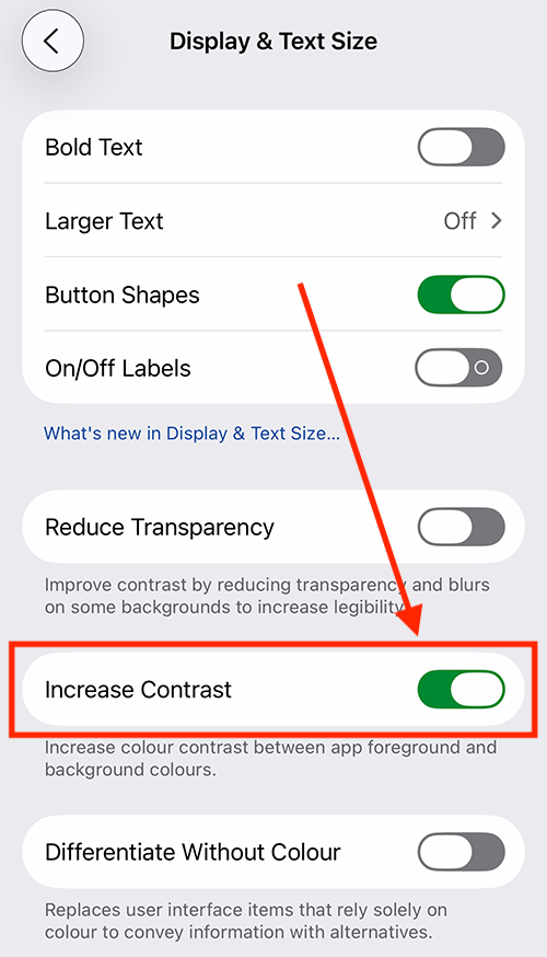 3. On the Display & Text Size screen, tap the toggle switch for Increase Contrast to turn it on.