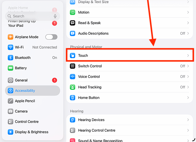 2. On the Accessibility screen, look under Physical and Motor and tap or click Touch.