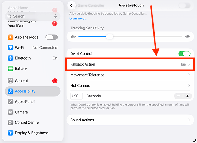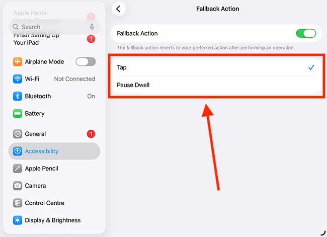 12. Dwell Control has its own useful settings. Fallback Action sets the action that Dwell Control reverts to after you have performed an operation. By default, this is turned off. Tap Fallback Action.