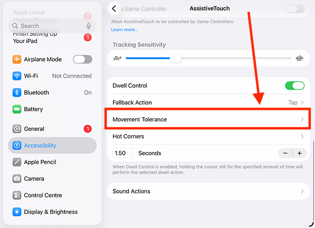 14. Movement Tolerance controls how far you can move the pointer before a dwell action is cancelled. To adjust the tolerance, tap Movement Tolerance.