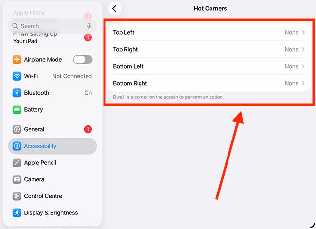 16. With Hot Corners, you can perform actions by dwelling in the corners of the screen. You can choose from a wide variety of actions, such as taking a screenshot, going to the Home screen, opening the Control Centre, performing an accessibility action, or running a shortcut. You can assign a different action to each corner. To set these up, click or tap Hot Corners.