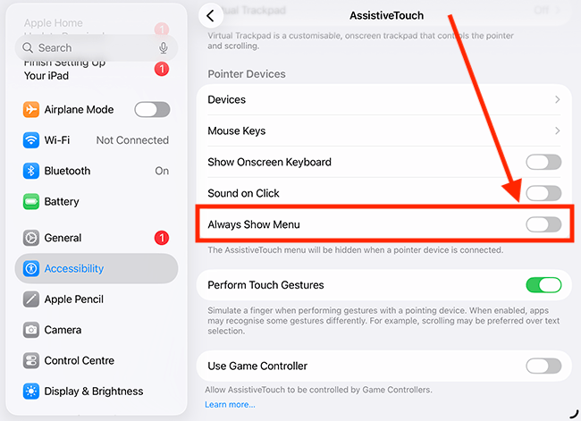 5. By default, when AssistiveTouch is enabled, the AssistiveTouch menu appears on the screen. This enables you to perform a variety of tasks on your device, but if you don’t want to show the AssistiveTouch button all the time, tap or click the toggle switch next to Always Show Menu to turn it off. You can still use the AssistiveTouch menu by assigning a button to trigger it.