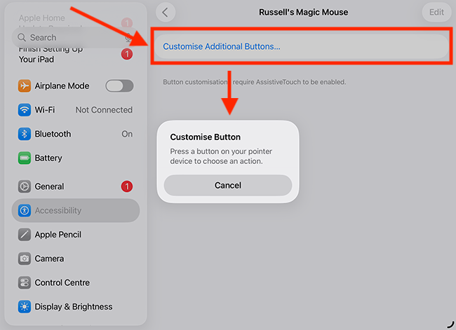 8. Tap or click Customise Additional Buttons. You will see a pop-up notification instructing you to press the button you wish to customise. Press a button on your device now. By default, the standard left and right buttons are already set up to perform Single-Tap and Right-Click gestures. However, these buttons can also be customised to perform other actions.