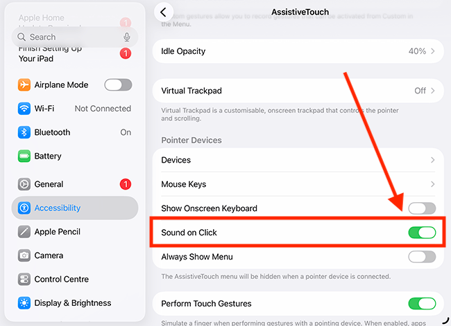 10. To hear a sound when you click the mouse or trackpad, tap the toggle switch for Sound on Click to turn it on.