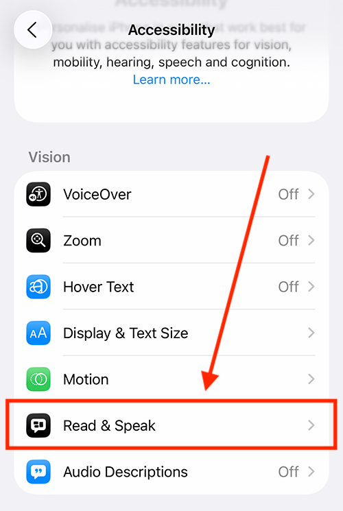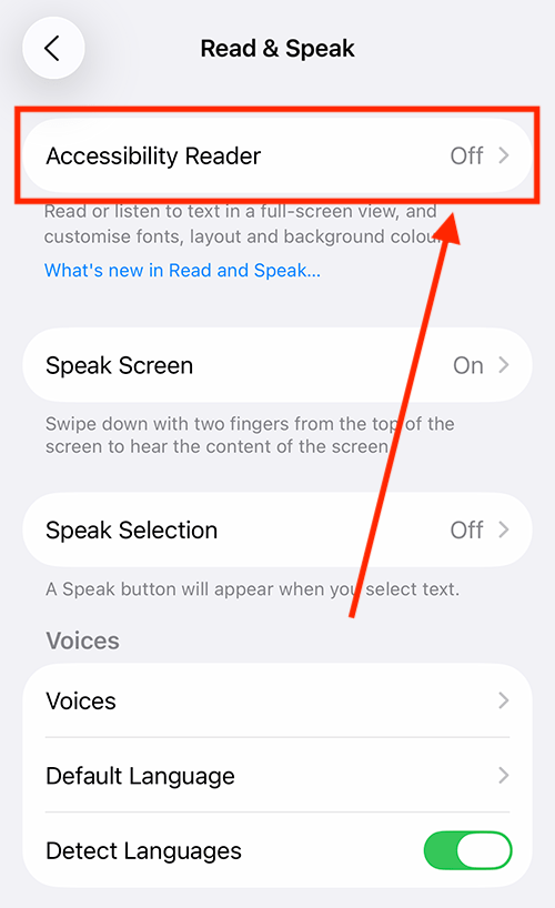 3. On the Read & Speak screen, tap Accessibility Reader.
