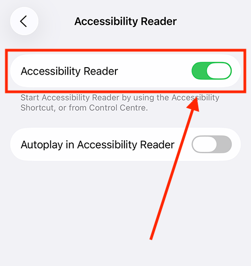 4. On the next page, tap the toggle switch for Accessibility Reader to turn it on.