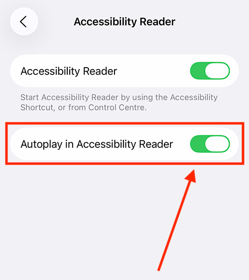 5. In addition to letting you reformat text to suit your preferences, Accessibility Reader can also read text aloud. If you like to have text read aloud automatically, tap the toggle switch for Autoplay in Accessibility Reader to turn it on.