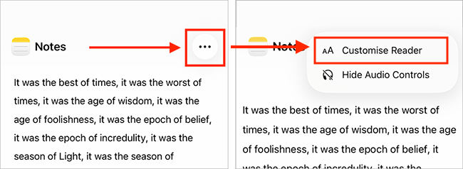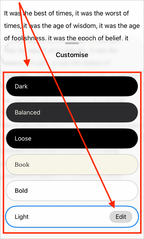7. To customize the appearance of the text, tap the ellipsis button ( … ) in the top-right, then select Customise Reader.