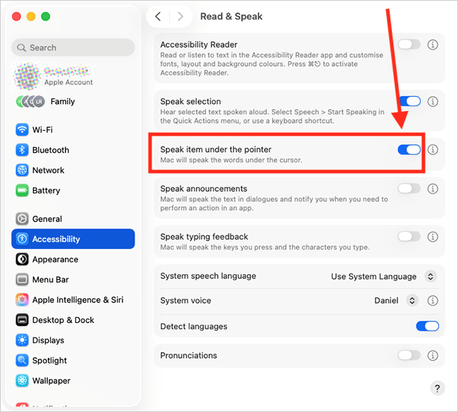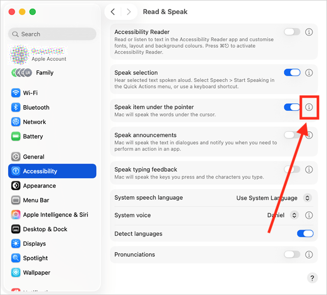 This section explains how to enable Speak items under the pointer in macOS 26 Tahoe. This is a step-by-step guide with pictures of the screens to help.