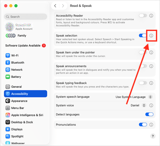 This section explains how to enable and use the Speak Selection feature in macOS 26 Tahoe. This is a step-by-step guide with pictures of the screens to help.