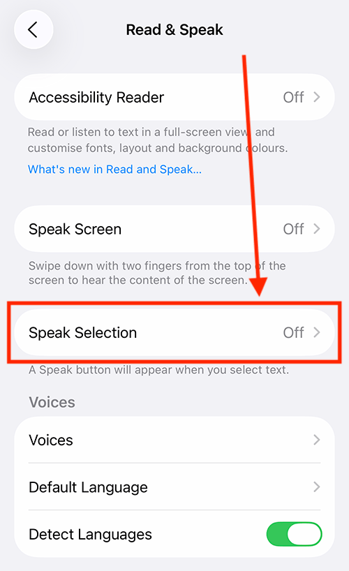This section gives you step by step instructions on how to enable and use the Speak Selection feature in iOS 26, with pictures of the screens to help.