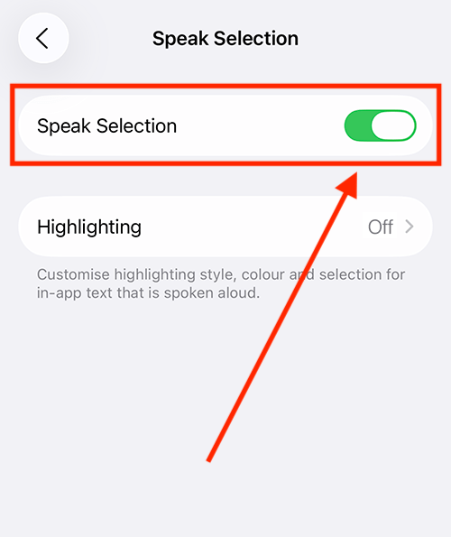 4. Tap the toggle switch for Speak Selection to turn it on.