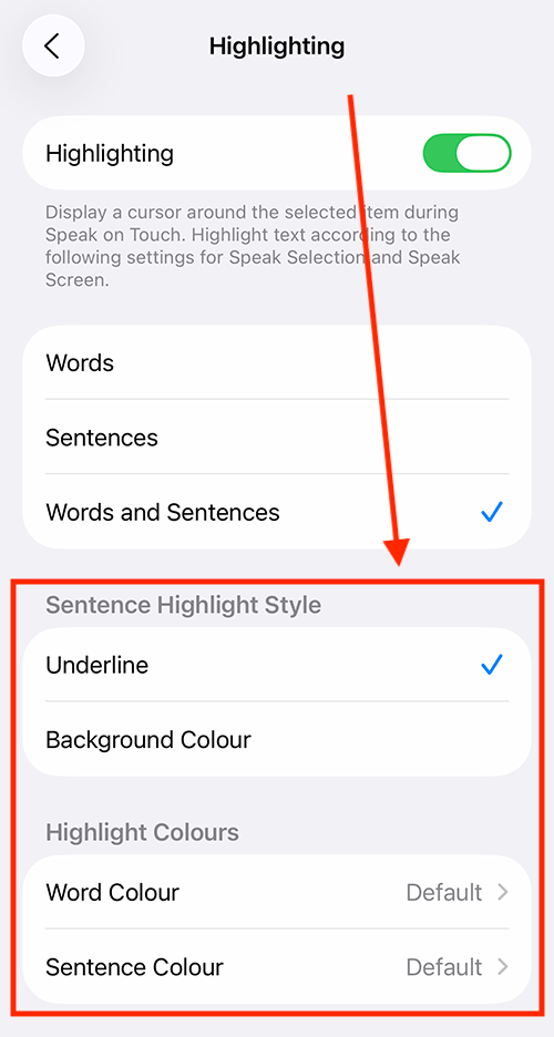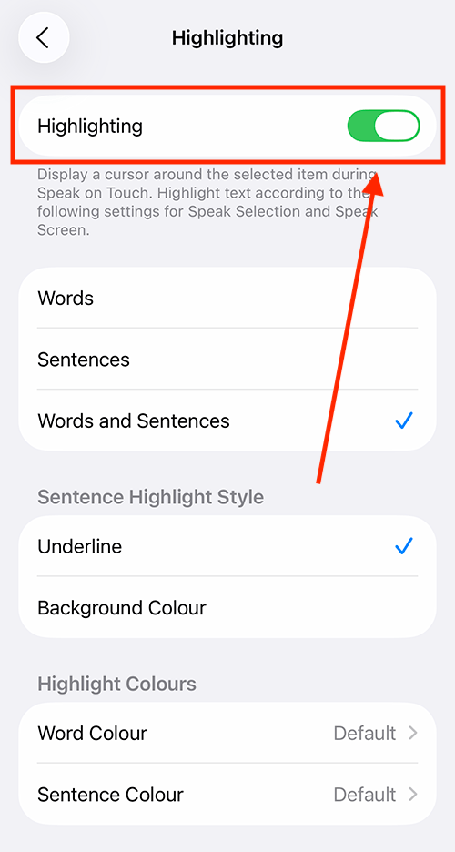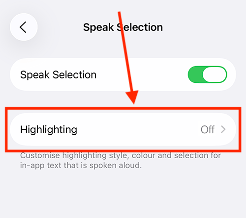 5. Speak Screen can highlight text as it’s read aloud. To enable this feature and customize the highlighting style, tap Highlighting.