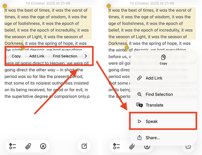 9. You can use Speak Selection anywhere text can be selected – such as in emails, websites, and documents. Simply select the text you want to hear (in the example below, we’ve selected text in the Notes app). A pop-up menu will appear. Tap the arrow button on the right side of the pop-up menu, then choose Speak.