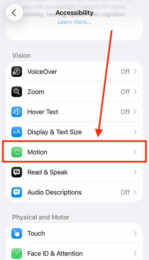 3. On the Motion screen, tap the toggle switch for Reduce Motion to turn it on.
