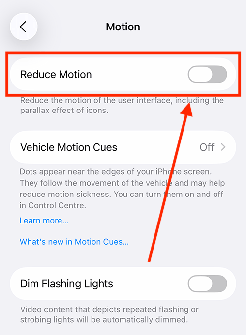 This section gives you step by step instructions on how to enabled Reduce Motion in iOS 26, with pictures of the screens to help.