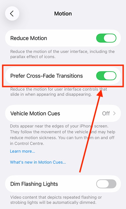4. Reduce Motion will turn off most animation effects. However, some interface controls and page transitions may still use a ‘slide-in’ effect. If you would prefer these to fade-in instead, tap the toggle switch for Prefer Cross-Fade Transitions to turn it on.
