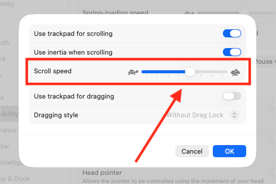5. In the pop-up window, adjust the Scrolling speed slider to control how quickly pages move when using the trackpad.