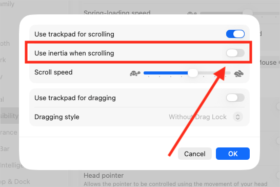 6. By default, scrolling uses an inertia effect, meaning the page continues to move briefly after you stop scrolling on the trackpad. To disable this effect, tap the toggle switch for Use inertia when scrolling to turn it off.