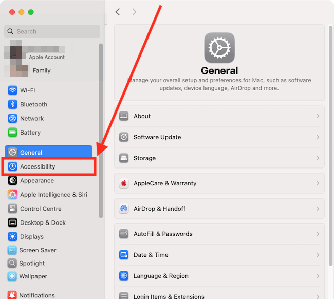 4. In the System Settings window, Select Accessibility in the sidebar.