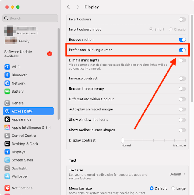 This section gives you step by step instructions on how to turn on the Prefer non-blinking cursor feature in macOS 15 Sequoia, with pictures of the screens to help.
