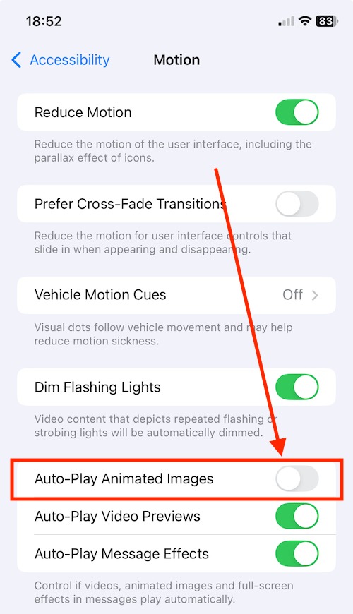 3. On the Motion screen, tap the toggle switch for Auto-Play Animated Images to turn it off.