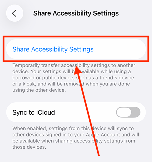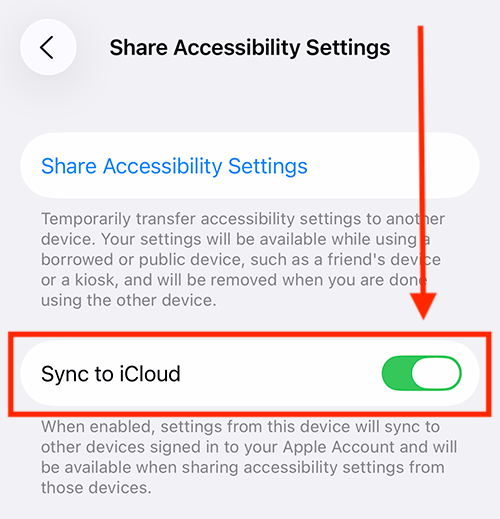 On the Share Accessibility Settings page (see steps 1 - 3, above), tap the toggle switch for Sync to iCloud to turn it on.
