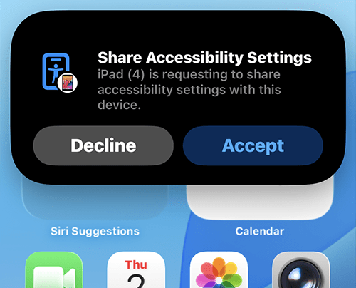 5. To accept the settings on the other device, either tap Accept, or tap and hold the screen with three fingers. You can now start using your accessibility settings on the other device.
