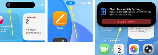 This section gives you step-by-step instructions on how to share your accessibility settings with another person's device in iOS 26, with pictures of the screens to help.
