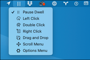 | Always dwell in menu extras | Always use Dwell to select items in the menu bar along the top-right of the screen, even when Dwell is paused. The default action for this is Left-click. |