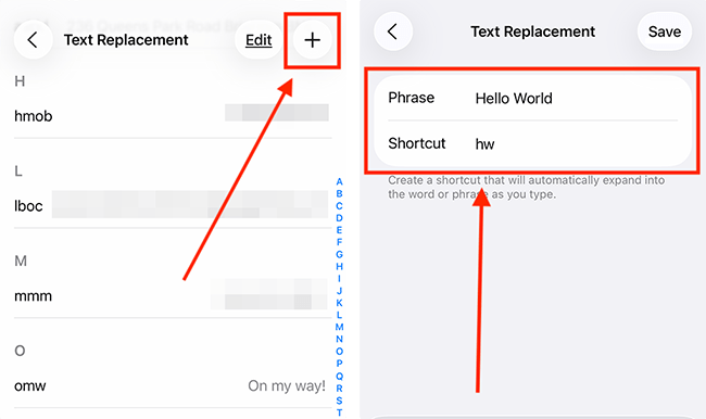 4. To create a new Text Replacement shortcut, tap the + (plus) button in the top-right corner. Type the phrase you would like inserted when you type the shortcut. In our example we used the phrase “Hello World”. Now type the shortcut you would like to trigger this phrase. In our example the shortcut is “hw”. Tap Save in the top-right corner