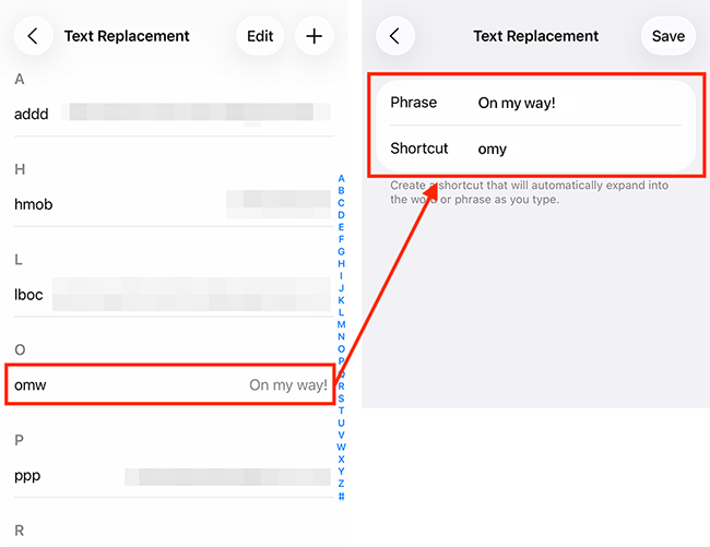 5. To edit a shortcut, tap the item you want to edit, then tap on the phrase or shortcut to insert the cursor and start editing. When you have finished, select Save in the top-right corner.