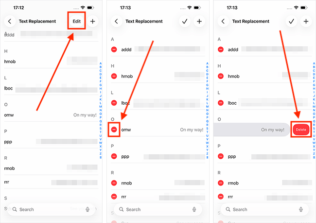 6. To delete a Text Replacement shortcut, tap Edit in the top-right corner. Tap the - (minus) icon next to the item you wish to delete, then tap the Delete button. if you only want to delete one item, you can swipe left on it to reveal the Delete button. Tap Delete or keep swiping left to delete the shortcut.