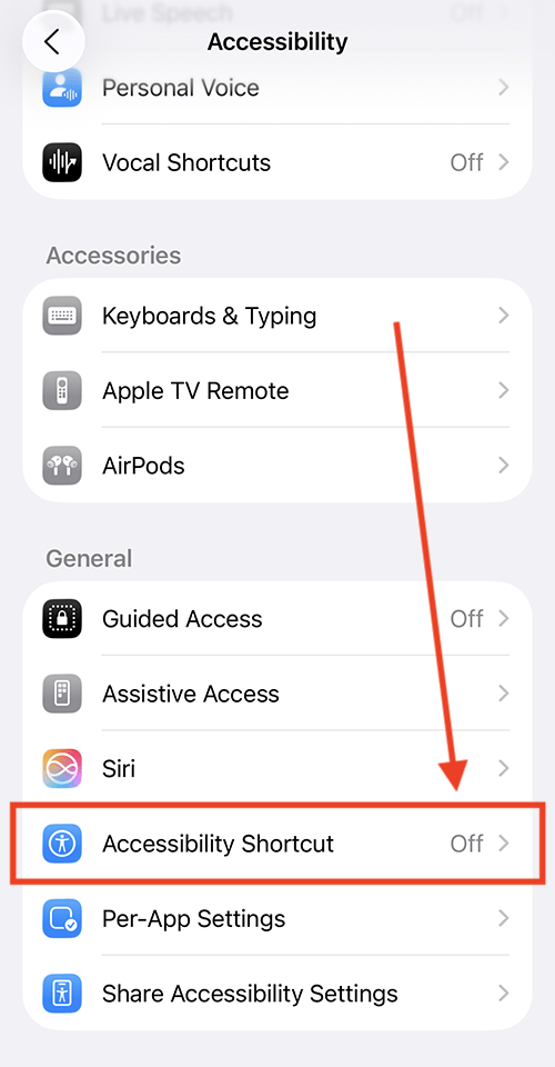 2. On the Accessibility screen, scroll to the bottom and select Accessibility Shortcut.