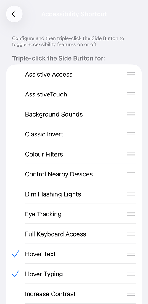 This section explains how to set-up and use the accessibility shortcut in Apple iOS 26, with step-by-step instructions and pictures of the screen to help.