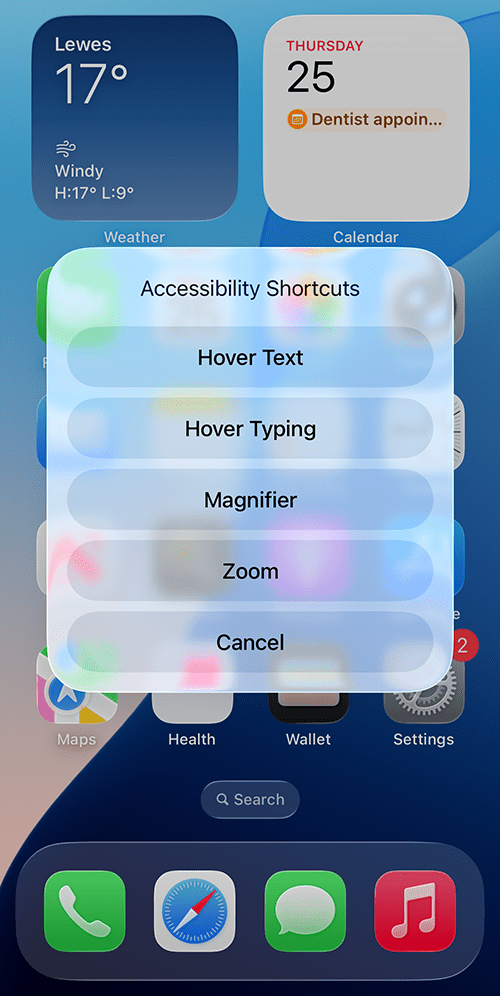 4. To use the Accessibility Shortcut, triple-click the Home button on devices that have a Home button, or the Side button on devices with Face ID. If you only assigned one feature to the Accessibility Shortcut, it will open straight away. Triple-click the button again to disable it. If you assigned multiple features to the Accessibility Shortcut, select one from the menu.