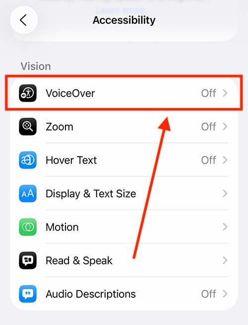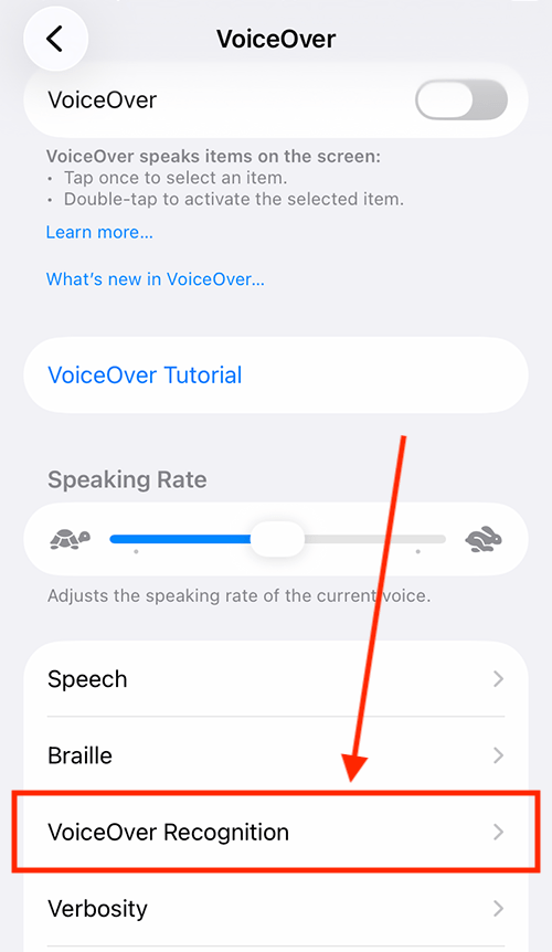 3. On the Voiceover screen, tap VoiceOver Recognition.